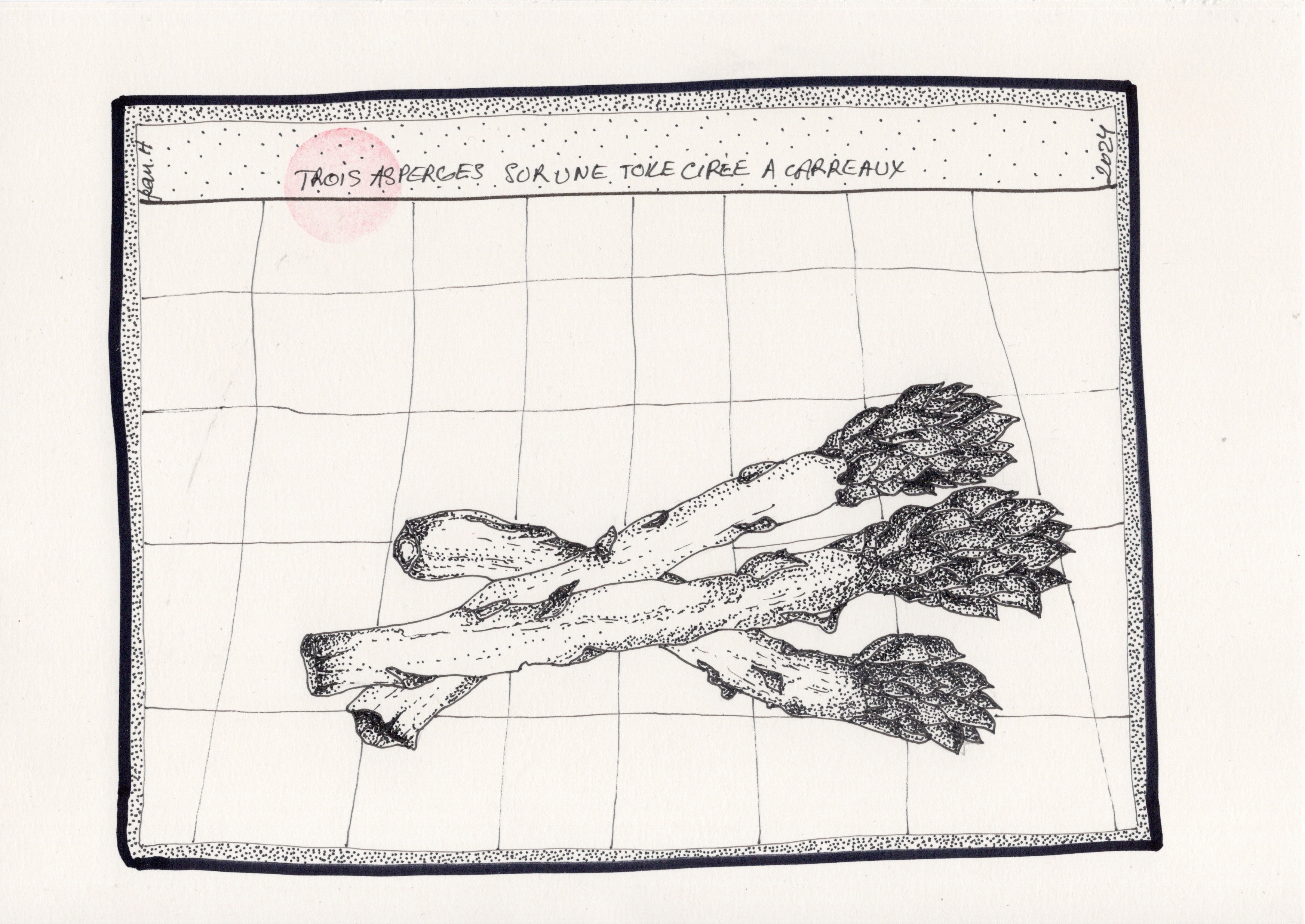 Trois asperges sur une toile cirée à carreaux