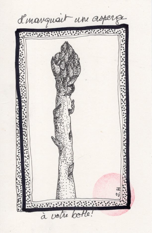 Le peintre Édouard Manet vend à Charles Ephrussi un tableau intitulé « Une botte d’asperges » pour la somme de huit cents francs. Mais Ephrussi lui fait parvenir mille francs. Manet, toujours prompt à allier esprit et élégance, décide alors de peindre un petit tableau, représentant une seule asperge, accompagné d’un petit mot disant : « Il en manquait une à votre botte. »