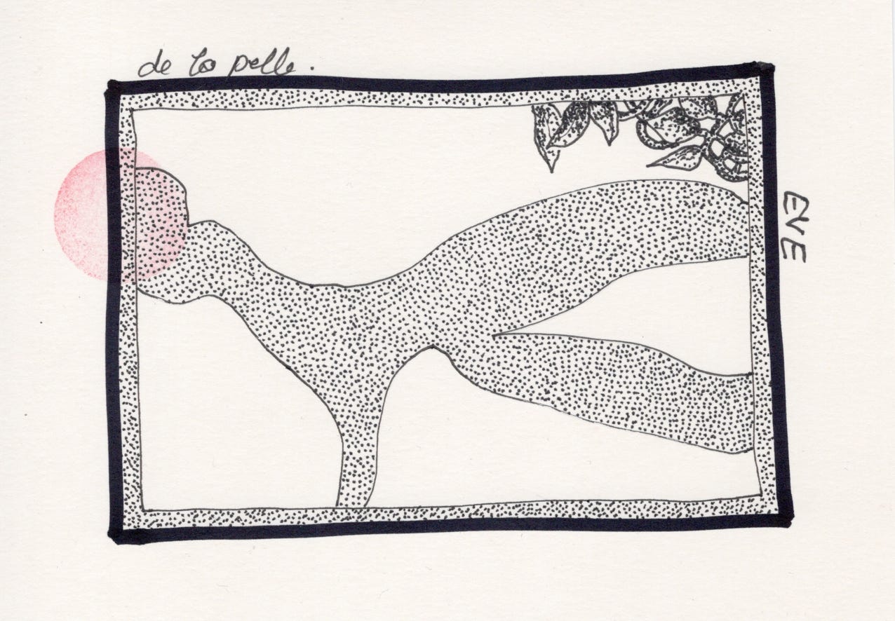 L'encadrement des corps, conçu comme un dispositif de frontière visuelle, participe d’une dialectique de l'interdit et de la transgression. Dans cette perspective, le jardin d’Éden n’est plus seulement un espace sacré ; il devient un lieu de potentialité érotique, un espace de transgression où l'interdit religieux s'entrechoque avec l'intensité de la découverte sensorielle. Le recours à "pelle" pour désigner un baiser accentue la profondeur de ce geste en tant que passage initiatique, un point de bascule entre la singularité de l’individu et la rencontre de l’Autre, entre l’intériorité et l’extériorité.