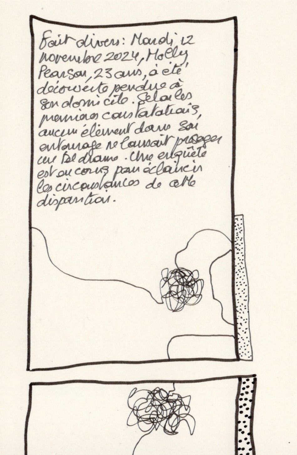 Un texte, un fil, un corps. La narration n’avance rien de plus que ce qu’elle énonce : une brève, un fait divers, un drame réduit à sa plus simple expression. (Il faudra sans doute que je me penche sur les nœuds.)